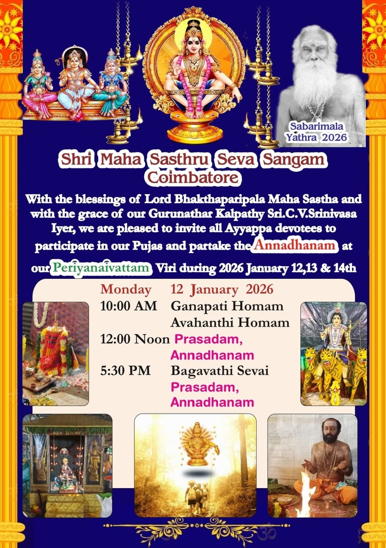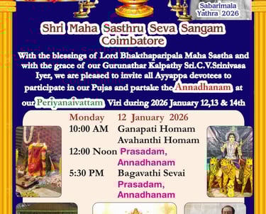 During the Makara Jyoti Yatra, our group will be arranging annadanam and other essential sevas for devotees, including daily prasadam along the journey. To make this possible, we need support for items like rice, dal, vegetables, oil, spices, milk, fruits, and other pooja and cooking materials that are required throughout the trip. Please click below for details!!!